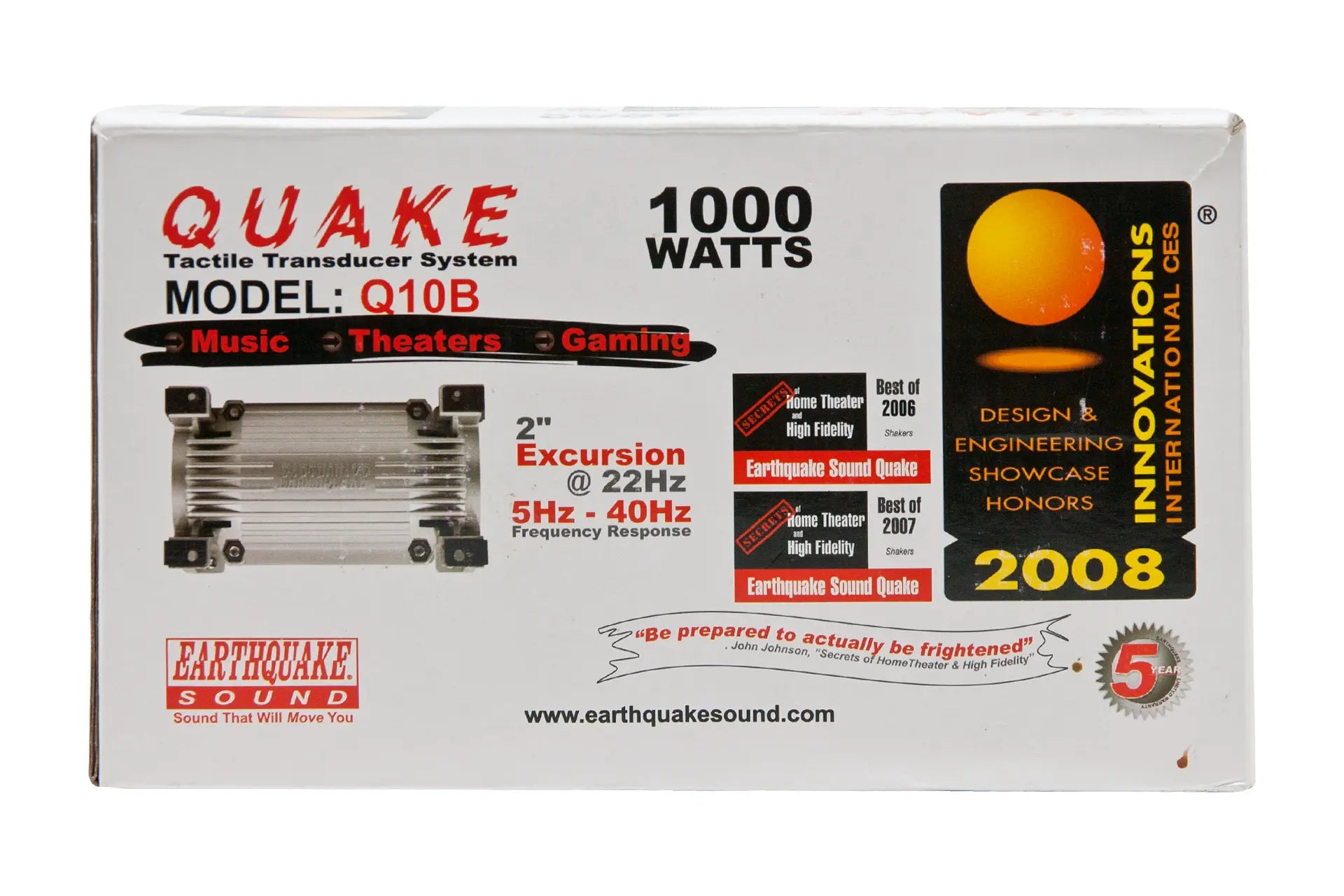 One Quake 10.0 can easily replace 5 traditional shakers and provide tactile power for 5 cinema chairs. With only one moving part Quake 10.0 is maintenance free. The chassis is a large heat sink made of cast aluminum, making it capable of extremely high performance. Universal mounting options are designed into the chassis. Quake 10.0 has a power handling capability of 1000 watts, yet it is so effective that an amplifier of 300 watts is plenty for private use.